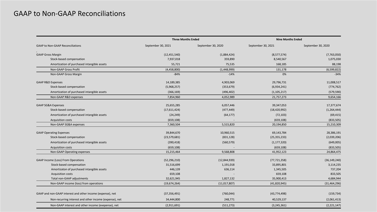 GAAP to Non-GAAP Reconciliations Three Months Ended Nine Months Ended GAAP to Non-GAAP Reconciliations September 30, 2021 September 30, 2020 September 30, 2021 September 30, 2020 GAAP Gross Margin (12,451,540) (1,884,424) (8,577,574) (7,763,050) Stock-based compensation 7,937,018 359,890 8,540,567 1,075,030 Amortization of purchased intangible assets 55,721 75,535 168,185 88,198 Non-GAAP Gross Profit (4,458,800) (1,448,999) 131,178 (6,599,822) Non-GAAP Gross Margin -84% -14% 0% -34% GAAP R&D Expenses 14,189,385 4,903,069 29,796,731 11,008,517 Stock-based compensation (5,968,257) (353,679) (6,934,241) (774,762) Amortization of purchased intangible assets (366,169) (496,402) (1,105,217) (579,590) Non-GAAP R&D expenses 7,854,960 4,052,989 21,757,273 9,654,166 GAAP SG&A Expenses 25,655,285 6,057,446 39,347,053 17,377,674 Stock-based compensation (17,611,424) (477,449) (18,420,992) (1,264,444) Amortization of purchased intangible assets (24,249) (64,177) (72,103) (69,415) Acquisition costs (659,108) - (659,108) (833,505) Non-GAAP SG&A expenses 7,360,504 5,515,820 20,194,850 15,210,309 GAAP Operating Expenses 39,844,670 10,960,515 69,143,784 28,386,191 Stock-based compensation (23,579,681) (831,128) (25,355,233) (2,039,206) Amortization of purchased intangible assets (390,418) (560,579) (1,177,320) (649,005) Acquisition costs (659,108) - (659,108) (833,505) Non-GAAP Operating expenses 15,215,464 9,568,808 41,952,123 24,864,475 GAAP Income (Loss) From Operations (52,296,210) (12,844,939) (77,721,358) (36,149,240) Stock-based compensation 31,516,699 1,191,018 33,895,801 3,114,235 Amortizaton of purchased intangible assets 446,139 636,114 1,345,505 737,204 Acquisition costs 659,108 - 659,108 833,505 Total non-GAAP adjustments 32,621,945 1,827,132 35,900,413 4,684,944 Non-GAAP income (loss) from operations (19,674,264) (11,017,807) (41,820,945) (31,464,296) GAAP and non-GAAP interest and other income (expense), net (37,356,491) (760,044) (43,774,498) (159,734) Non-recurring interest and other income (expense), net 34,444,800 248,771 40,529,137 (2,061,413) Non-GAAP interest and other income (exepense), net (2,911,691) (511,273) (3,245,361) (2,221,147)