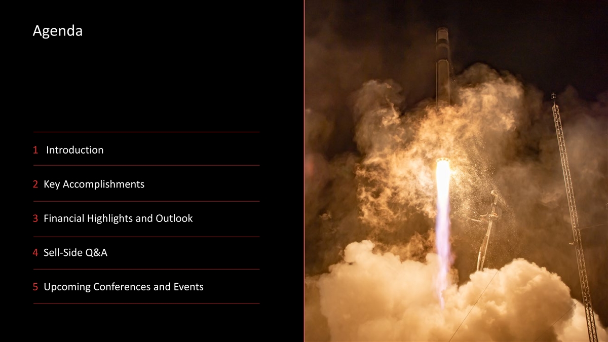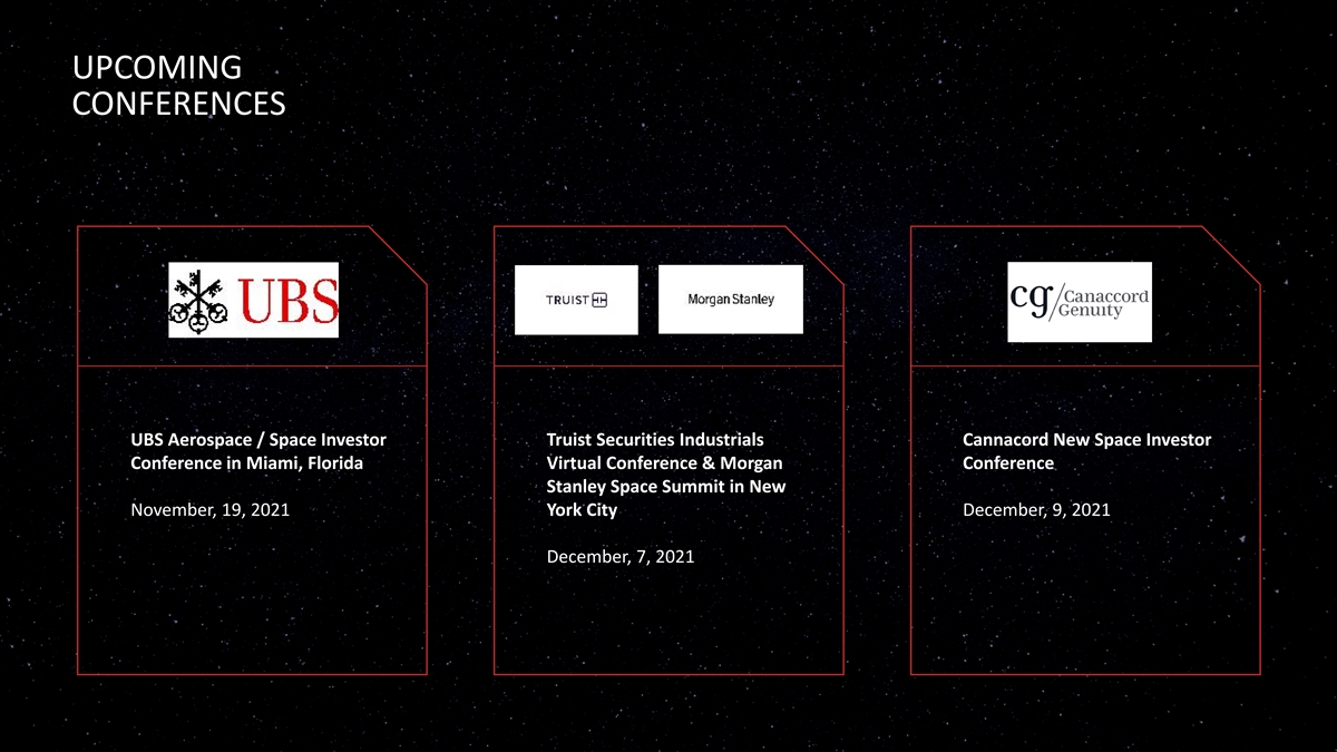 UPCOMING CONFERENCES UBS Aerospace / Space Investor Truist Securities Industrials Cannacord New Space Investor Conference in Miami, Florida Virtual Conference & Morgan Conference Stanley Space Summit in New November, 19, 2021 York City December, 9, 2021 December, 7, 2021