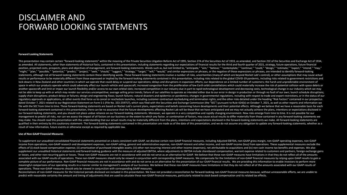 DISCLAIMER AND FORWARD LOOKING STATEMENTS Forward Looking Statements This presentation may contain certain “forward-looking statements” within the meaning of the Private Securities Litigation Reform Act of 1995, Section 27A of the Securities Act of 1933, as amended, and Section 21E of the Securities and Exchange Act of 1934, as amended. All statements, other than statements of historical facts, contained in this presentation, including statements regarding our expectations of financial results for the third and fourth quarter of 2021, strategy, future operations, future financial position, projected costs, prospects, plans and objectives of management, are forward-looking statements. Words such as, but not limited to, “anticipate,” “aim,” “believe,” “contemplate,” “continue,” “could,” “design,” “estimate,” “expect,” “intend,” “may,” “might,” “plan,” “possible,” “potential,” “predict,” “project,” “seek,” “should,” “suggest,” “strategy,” “target,” “will,” “would,” and similar expressions or phrases, or the negative of those expressions or phrases, are intended to identify forward-looking statements, although not all forward-looking statements contain these identifying words. These forward-looking statements involve a number of risks, uncertainties (many of which are beyond Rocket Lab’s control), or other assumptions that may cause actual results or performance to be materially different from those expressed or implied by the forward-looking statements contained in this presentation, including risks related to the global COVID-19 pandemic, including risks related to government restrictions and lock-downs in New Zealand and other countries in which we operate that could delay or suspend our operations; delays and disruptions in expansion efforts; our dependence on a limited number of customers; the harsh and unpredictable environment of space in which our products operate which could adversely affect our launch vehicle and spacecraft; increased congestion from the proliferation of low Earth orbit constellations which could materially increase the risk of potential collision with space debris or another spacecraft and limit or impair our launch flexibility and/or access to our own orbital slots; increased competition in our industry due in part to rapid technological development and decreasing costs, technological change in our industry which we may not be able to keep up with or which may render our services uncompetitive; average selling price trends; failure of our satellites to operate as intended either due to our error in design in production or through no fault of our own; launch schedule disruptions; supply chain disruptions; product delays or failures; design and engineering flaws; launch failures; natural disasters and epidemics or pandemics; changes in governmental regulations, including with respect to trade and export restrictions, or in the status of our regulatory approvals or applications, or other events that force us to cancel or reschedule launches, including customer contractual rescheduling and termination rights; and the other risks detailed under the heading “Risk Factors” contained in our prospectus dated October 7, 2021 related to our Registration Statement on Form S-1 (File No. 333-259757), which was filed with the Securities and Exchange Commission (the SEC ) pursuant to Rule 424(b) on October 7, 2021, as well as other reports and information we file with the SEC from time to time. These forward-looking statements are based on Rocket Lab’s current plans, expectations and beliefs concerning future developments and their potential effects. Although we believe that we have a reasonable basis for each forward-looking statement contained in this presentation, there can be no assurance that the future developments affecting Rocket Lab will be those that we have anticipated and we may not actually achieve the plans, intentions or expectations disclosed in our forward-looking statements, and you should not place undue reliance on our forward-looking statements. Moreover, we operate in a very competitive and rapidly changing environment. New risks emerge from time to time. It is not possible for our management to predict all risks, nor can we assess the impact of all factors on our business or the extent to which any factor, or combination of factors, may cause actual results to differ materially from those contained in any forward-looking statements we may make. You should read this presentation with the understanding that our actual results may be materially different from the plans, intentions and expectations disclosed in the forward-looking statements we make. All forward-looking statements are qualified in their entirety by this cautionary statement. The forward-looking statements contained in this presentation are made as of the date of this presentation, and we do not assume any obligation to update any forward-looking statements, whether as a result of new information, future events or otherwise except as required by applicable law. Use of Non-GAAP Financial Measures To supplement our unaudited consolidated financial statements presented on a basis consistent with GAAP, we disclose certain non-GAAP financial measures, including Adjusted EBITDA, non-GAAP gross margin, non-GAAP operating expenses, non-GAAP income from operations, non-GAAP research and development expenses, non-GAAP selling, general and administrative expense, non-GAAP interest and other income, and non-GAAP income (loss) from operations. These supplemental measures exclude the effects of (i) stock-based compensation expense; (ii) amortization of purchased intangible assets; (iii) other non-recurring interest and other income (expenses), net attributable to acquisitions and (iv) non-cash income tax benefits and expenses. We also supplement our unaudited historical statements and forward-looking g