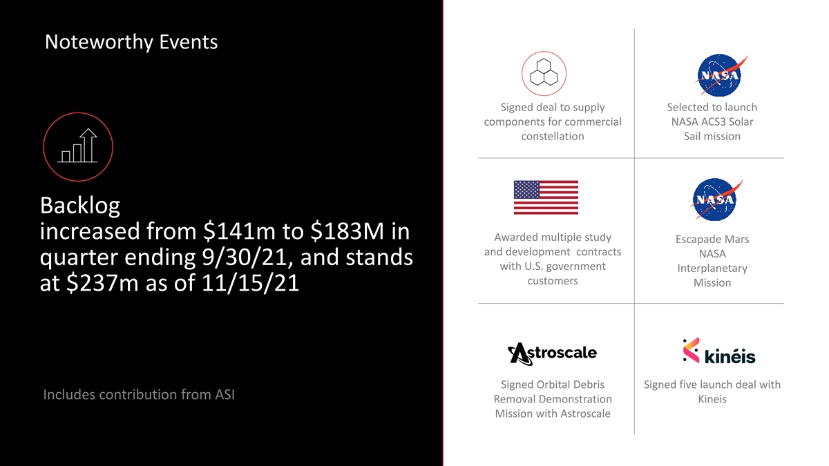 Noteworthy Events Signed deal to supply Selected to launch components for commercial NASA ACS3 Solar constellation Sail mission Backlog increased from $141m to $183M in Awarded multiple study Escapade Mars and development contracts NASA quarter ending 9/30/21, and stands with U.S. government Interplanetary customers Mission at $237m as of 11/15/21 Signed Orbital Debris Signed five launch deal with Includes contribution from ASI Removal Demonstration Kineis Mission with Astroscale