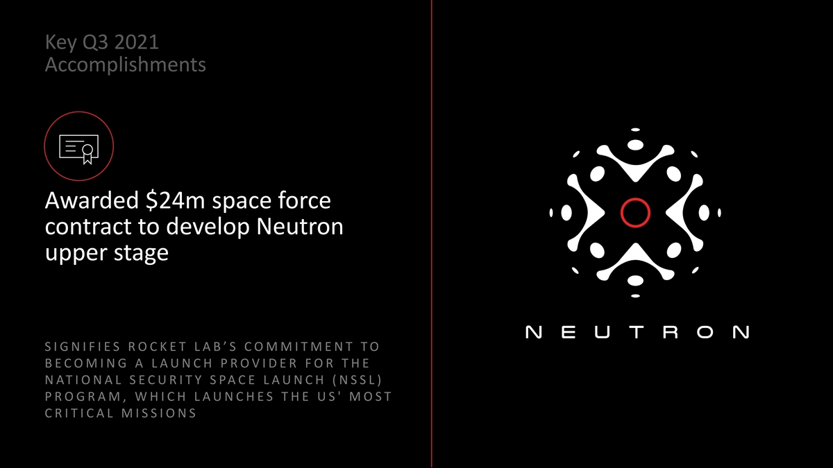 Key Q3 2021 Accomplishments Awarded $24m space force contract to develop Neutron upper stage SIGNIFIES ROCKET LAB’S COMMITMENT TO BECOMING A LAUNCH PROVIDER FOR THE NATIONAL SECURITY SPACE LAUNCH (NSSL) PROGRAM, WHICH LAUNCHES THE US' MOST CRITICAL MISSIONS
