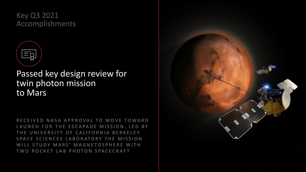 Key Q3 2021 Accomplishments Passed key design review for twin photon mission to Mars RECEIVED NASA APPROVAL TO MOVE TOWARD LAUNCH FOR THE ESCAPADE MISSION. LED BY THE UNIVERSITY OF CALIFORNIA BERKELEY SPACE SCIENCES LABORATORY THE MISSION WILL STUDY MARS’ MAGNETOSPHERE WITH TWO ROCKET LAB PHOTON SPACECRAFT