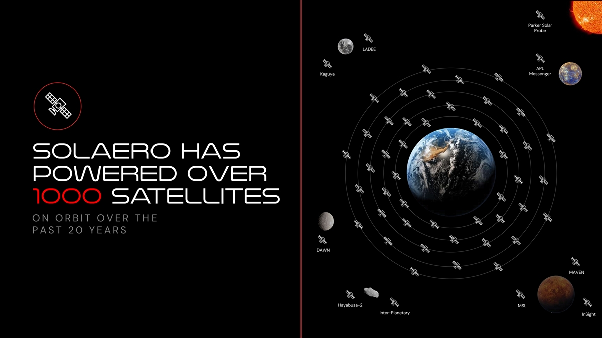 Parker Solar Probe LADEE APL Kaguya Messenger Solaero has powered over 1000 satellites ON ORBIT OVER THE PAST 20 YEARS DAWN MAVEN Hayabusa-2 MSL Inter-Planetary InSight