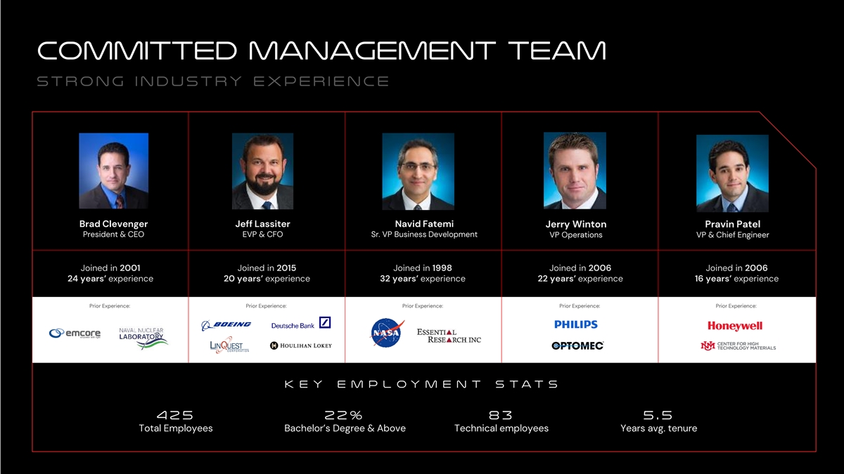 Committed Management Team Strong industry Experience Brad Clevenger Jeff Lassiter Navid Fatemi Jerry Winton Pravin Patel President & CEO EVP & CFO Sr. VP Business Development VP Operations VP & Chief Engineer Joined in 2001 Joined in 2015 Joined in 1998 Joined in 2006 Joined in 2006 24 years’ experience 20 years’ experience 32 years’ experience 22 years’ experience 16 years’ experience Prior Experience: Prior Experience: Prior Experience: Prior Experience: Prior Experience: K EY EM P L OY M EN T S TAT S 4 2 5 22 % 83 5. 5 Total Employees Bachelor’s Degree & Above Technical employees Years avg. tenure