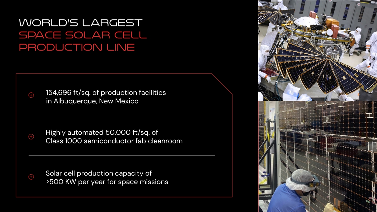 World’s largest space solar cell production line 154,696 ft/sq. of production facilities in Albuquerque, New Mexico Highly automated 50,000 ft/sq. of Class 1000 semiconductor fab cleanroom Solar cell production capacity of >500 KW per year for space missions