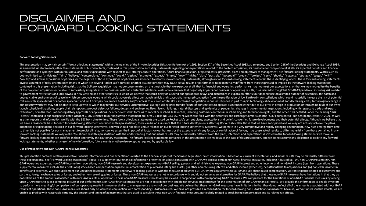 DISCLAIMER AND FORWARD LOOKING STATEMENTS Forward Looking Statements This presentation may contain certain “forward-looking statements” within the meaning of the Private Securities Litigation Reform Act of 1995, Section 27A of the Securities Act of 1933, as amended, and Section 21E of the Securities and Exchange Act of 1934, as amended. All statements, other than statements of historical facts, contained in this presentation, including statements regarding our expectations related to the SolAero acquisition, its timetable for completion (if at all), its expected benefits and financial performance and synergies with our business, and other expectations with respect to our, strategy, future operations, future financial position, projected costs, prospects, plans and objectives of management, are forward-looking statements. Words such as, but not limited to, “anticipate,” “aim,” “believe,” “contemplate,” “continue,” “could,” “design,” “estimate,” “expect,” “intend,” “may,” “might,” “plan,” “possible,” “potential,” “predict,” “project,” “seek,” “should,” “suggest,” “strategy,” “target,” “will,” “would,” and similar expressions or phrases, or the negative of those expressions or phrases, are intended to identify forward-looking statements, although not all forward-looking statements contain these identifying words. These forward-looking statements involve a number of risks, uncertainties (many of which are beyond Rocket Lab’s control), or other assumptions that may cause actual results or performance to be materially different from those expressed or implied by the forward-looking statements contained in this presentation, including risks that the SolAero acquisition may not be consummated on the timetable that we expect or at all, that its financial and operating performance may not meet our expectations, or that we may not realize the benefits of the proposed acquisition or be able to successfully integrate into our business without substantial additional costs or in a manner that negatively impacts our business or operating results; risks related to the global COVID-19 pandemic, including risks related to government restrictions and lock-downs in New Zealand and other countries in which we operate that could delay or suspend our operations; delays and disruptions in expansion efforts; our dependence on a limited number of customers; the harsh and unpredictable environment of space in which our products operate which could adversely affect our launch vehicle and spacecraft; increased congestion from the proliferation of low Earth orbit constellations which could materially increase the risk of potential collision with space debris or another spacecraft and limit or impair our launch flexibility and/or access to our own orbital slots; increased competition in our industry due in part to rapid technological development and decreasing costs, technological change in our industry which we may not be able to keep up with or which may render our services uncompetitive; average selling price trends; failure of our satellites to operate as intended either due to our error in design in production or through no fault of our own; launch schedule disruptions; supply chain disruptions; product delays or failures; design and engineering flaws; launch failures; natural disasters and epidemics or pandemics; changes in governmental regulations, including with respect to trade and export restrictions, or in the status of our regulatory approvals or applications, or other events that force us to cancel or reschedule launches, including customer contractual rescheduling and termination rights; and the other risks detailed under the heading “Risk Factors” contained in our prospectus dated October 7, 2021 related to our Registration Statement on Form S-1 (File No. 333-259757), which was filed with the Securities and Exchange Commission (the SEC ) pursuant to Rule 424(b) on October 7, 2021, as well as other reports and information we file with the SEC from time to time. These forward-looking statements are based on Rocket Lab’s current plans, expectations and beliefs concerning future developments and their potential effects. Although we believe that we have a reasonable basis for each forward-looking statement contained in this presentation, there can be no assurance that the future developments affecting Rocket Lab will be those that we have anticipated and we may not actually achieve the plans, intentions or expectations disclosed in our forward-looking statements, and you should not place undue reliance on our forward-looking statements. Moreover, we operate in a very competitive and rapidly changing environment. New risks emerge from time to time. It is not possible for our management to predict all risks, nor can we assess the impact of all factors on our business or the extent to which any factor, or combination of factors, may cause actual results to differ materially from those contained in any forward-looking statements we may make. You should read this presentation with the understanding that our actual results may be materially different from the plans, intentions and expectations disclosed in the forward-looking statements we make. All forward-looking statements are qualified in their entirety by this cautionary statement. The forward-looking statements contained in this presentation are made as of the date of this presentation, and we do not assume any obligation to update any forward- looking statements, whether as a result of new information, future events or otherwise except as required by applicable law. Use of Prospective and Non-GAAP Financial Measures This presentation contains certain prospective financial information and our expectations related to the financial impact of the SolAero acquisition. Such information is based on our current expectations, and actual results may be materiall