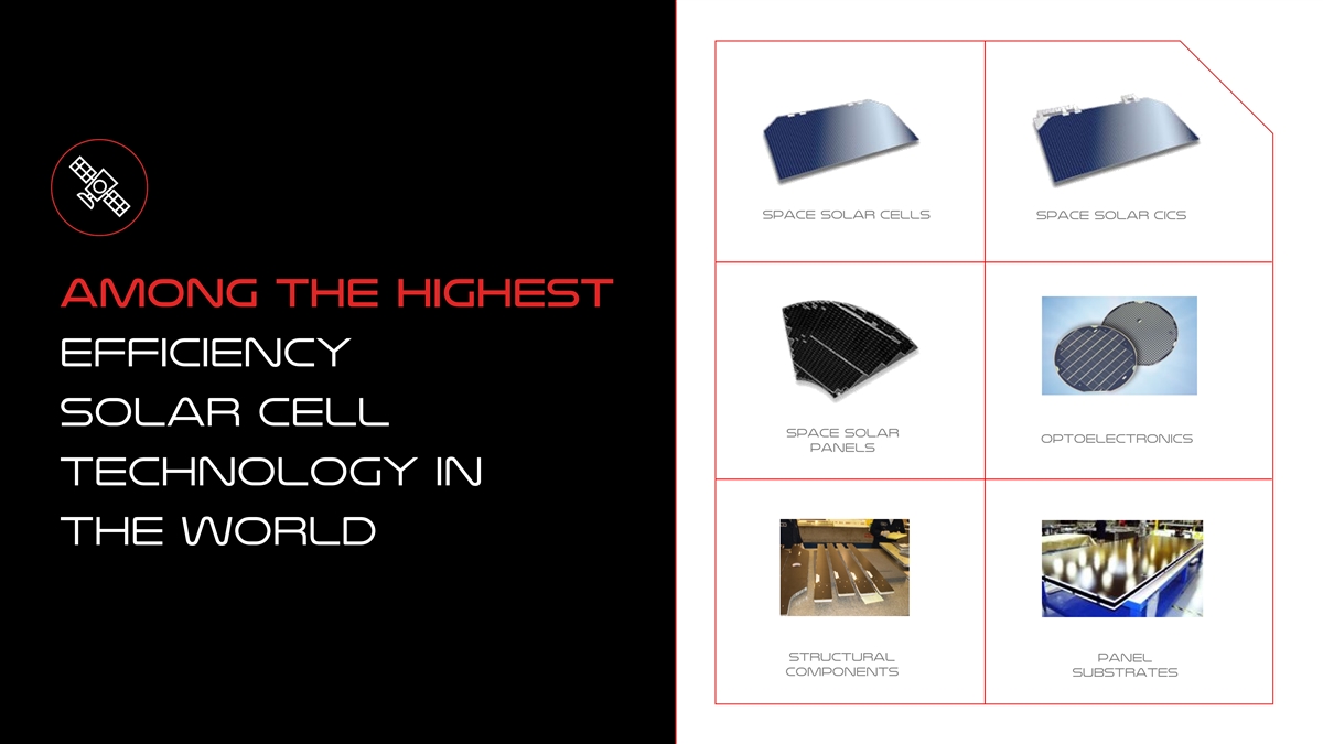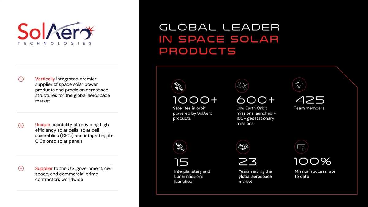 Global leader in space solar products Vertically integrated premier supplier of space solar power products and precision aerospace structures for the global aerospace market 1000+ 600+ 425 Satellites in orbit Low Earth Orbit Team members powered by SolAero missions launched + products 100+ geostationary missions Unique capability of providing high efficiency solar cells, solar cell assemblies (CICs) and integrating its CICs onto solar panels 100% 23 15 Supplier to the U.S. government, civil Interplanetary and Years serving the Mission success rate space, and commercial prime Lunar missions global aerospace to date contractors worldwide launched market