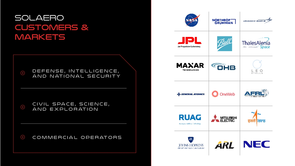 solaero customers & Markets D ef en se, intelligence, and national security Civil space, science, and exploration Commercial Operators